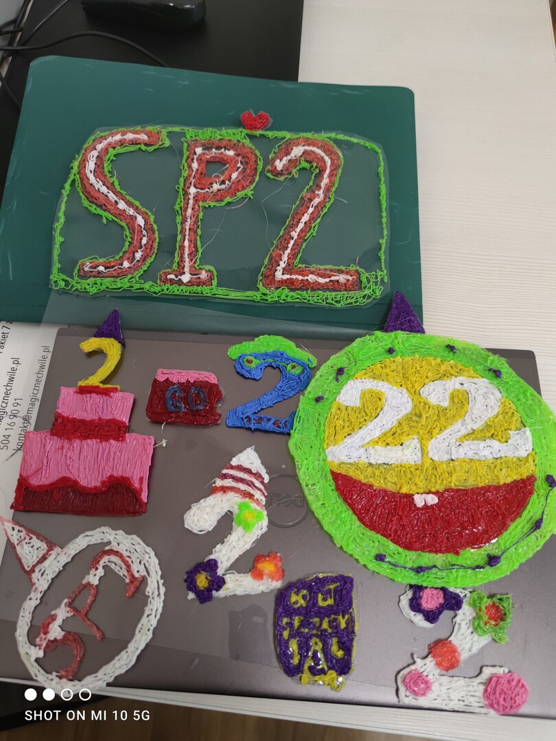 Na zajęciach Kółka CMI uczniowie wykorzystując długopisy 3D, zakupione z projektu "Laboratoria Przyszłości", zaprojektowali i wykonali model naszej szkolnej "dwójeczki" w urodzinowym nastroju.