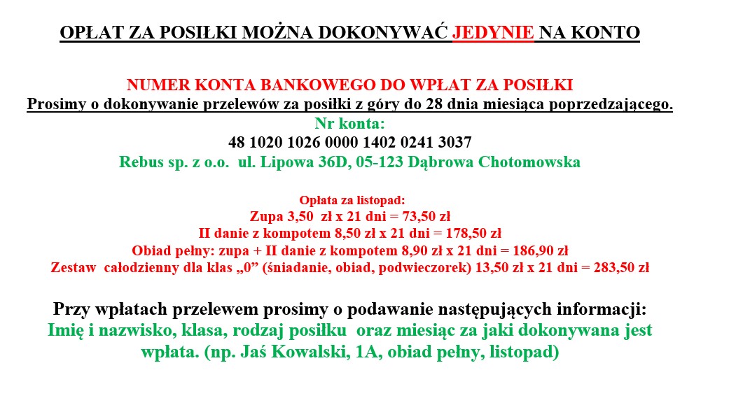 Strona główna Jadłospis Opłata za obiady - listopad