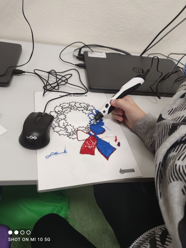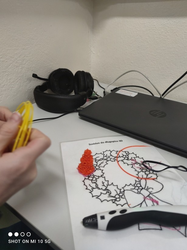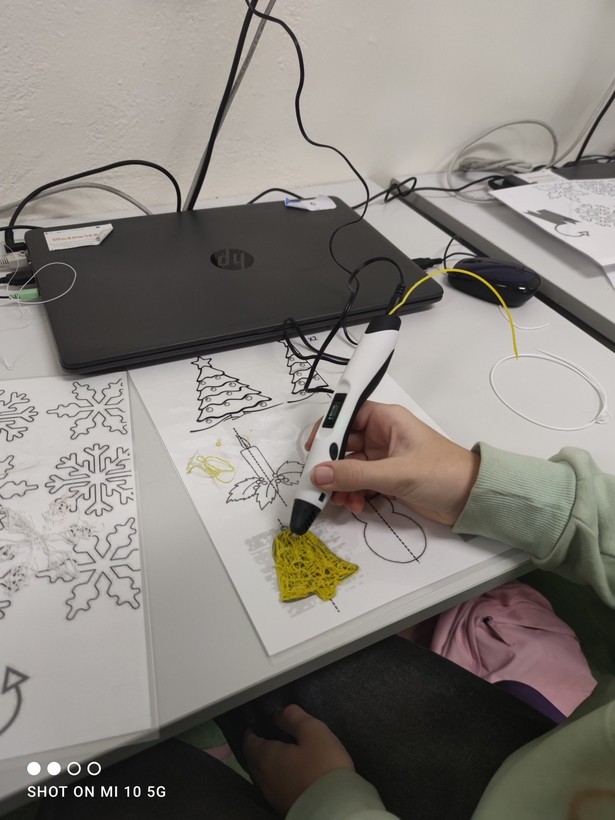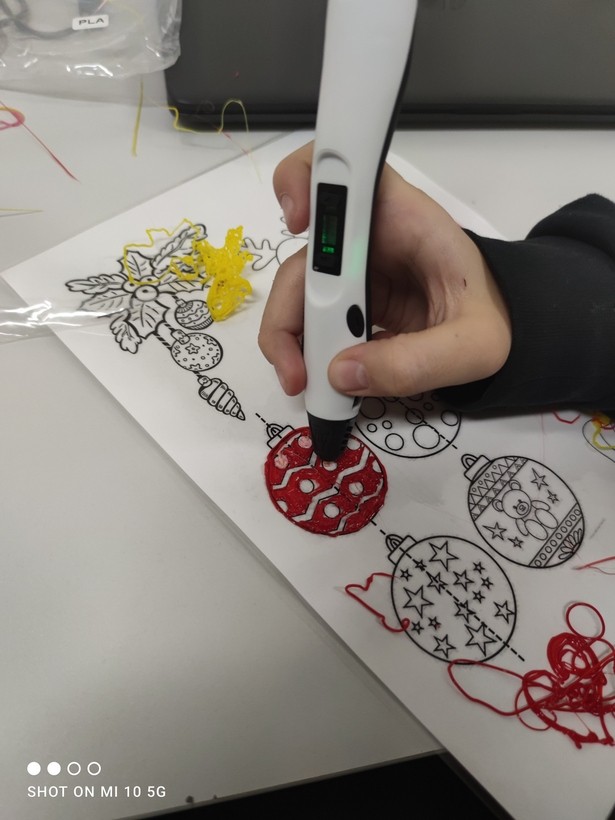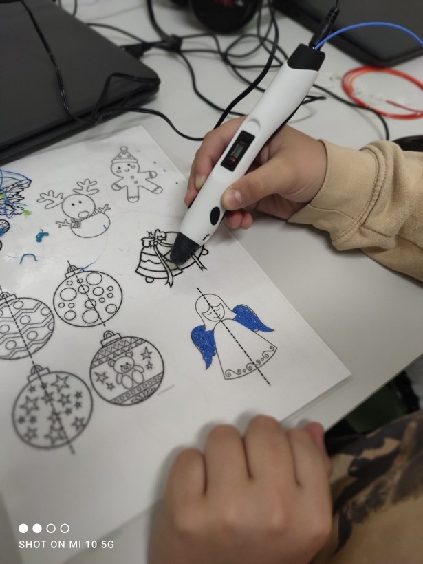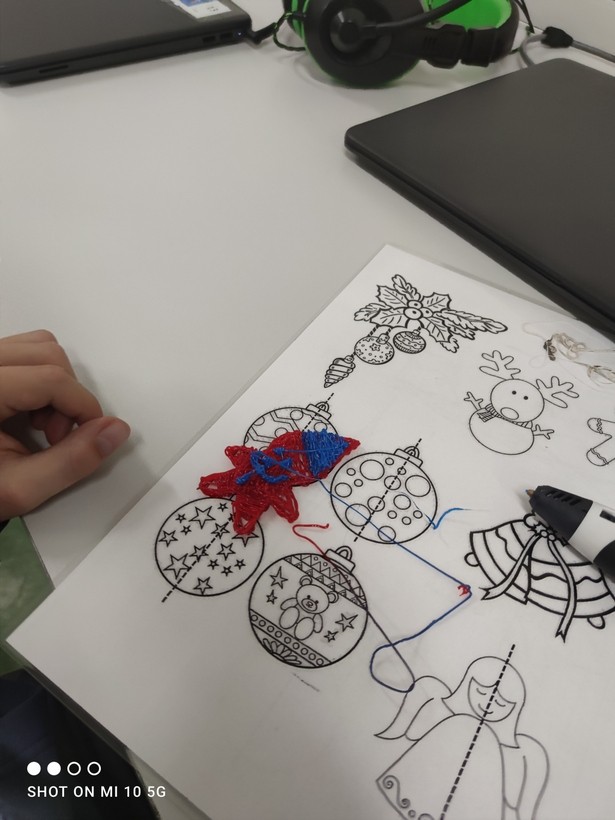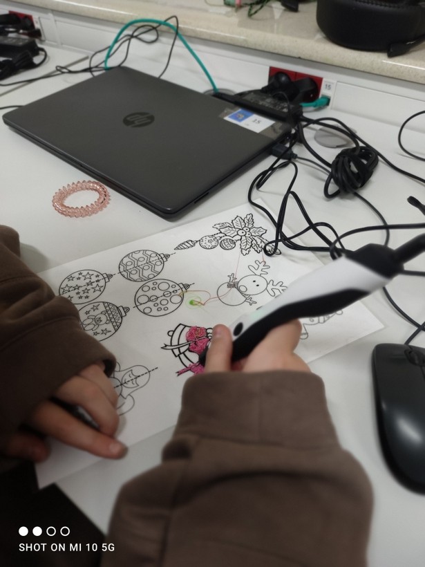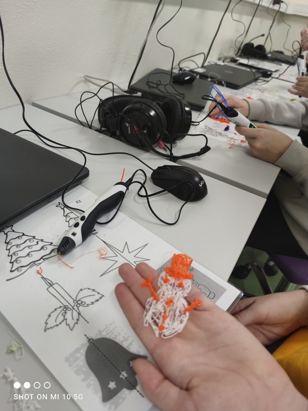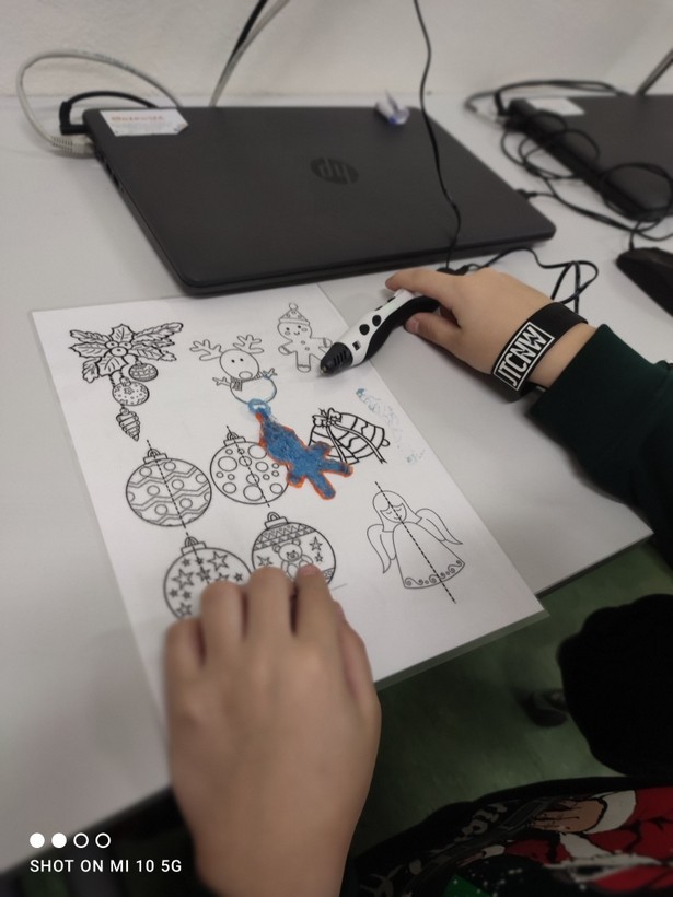 W świątecznym nastroju uczniowie klas 5, na lekcjach informatyki, tworzą wspaniałe zimowe, świąteczne ozdoby z wykorzystaniem długopisów 3D.