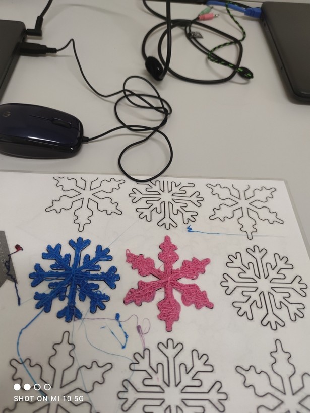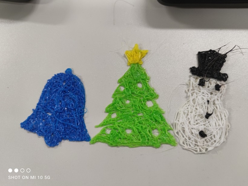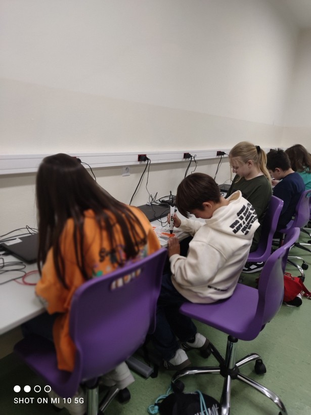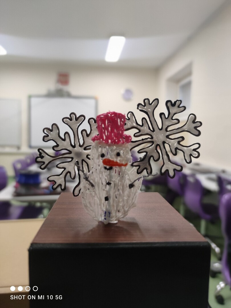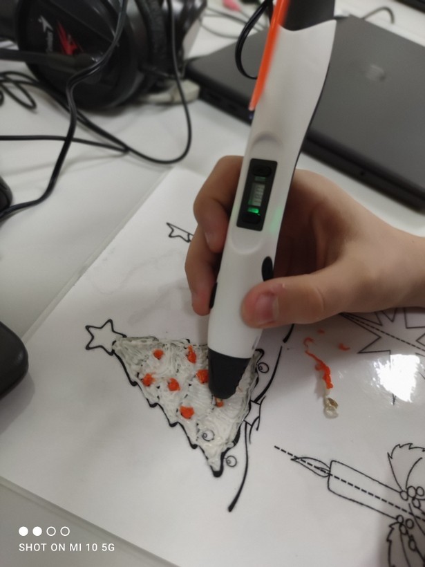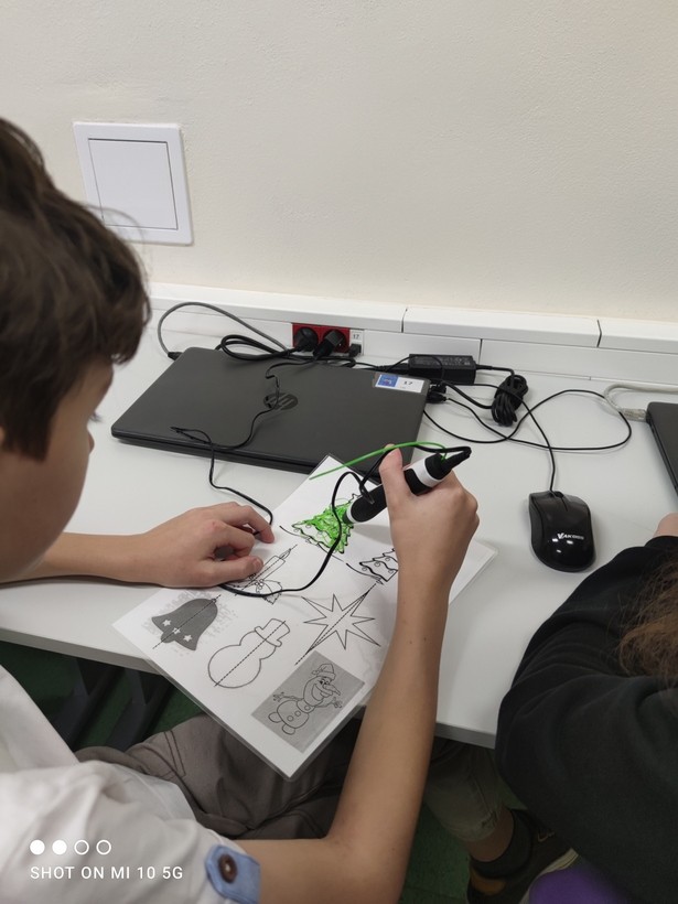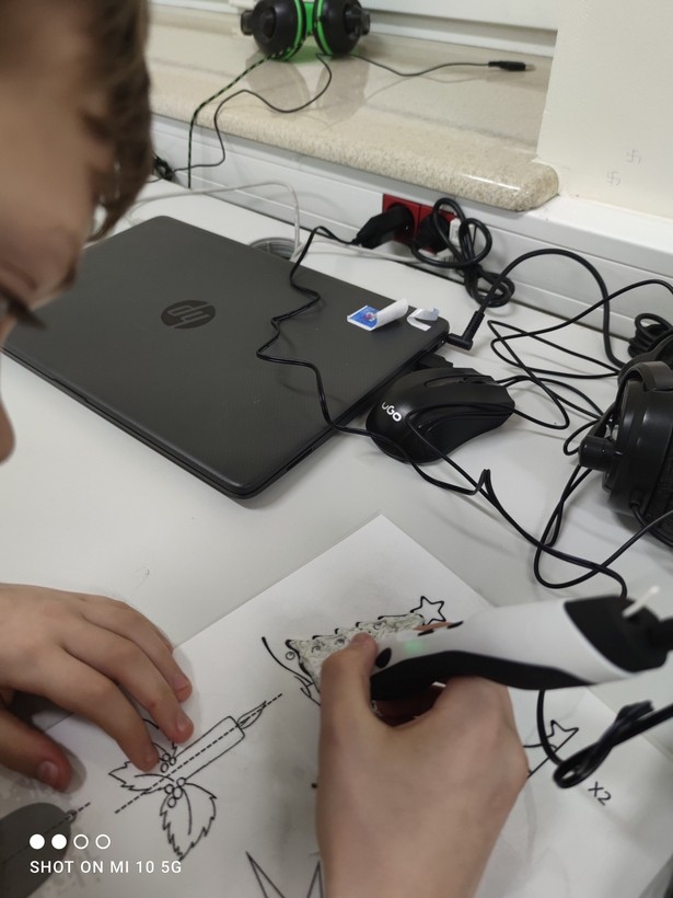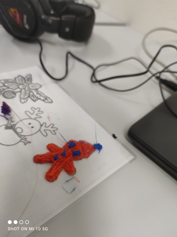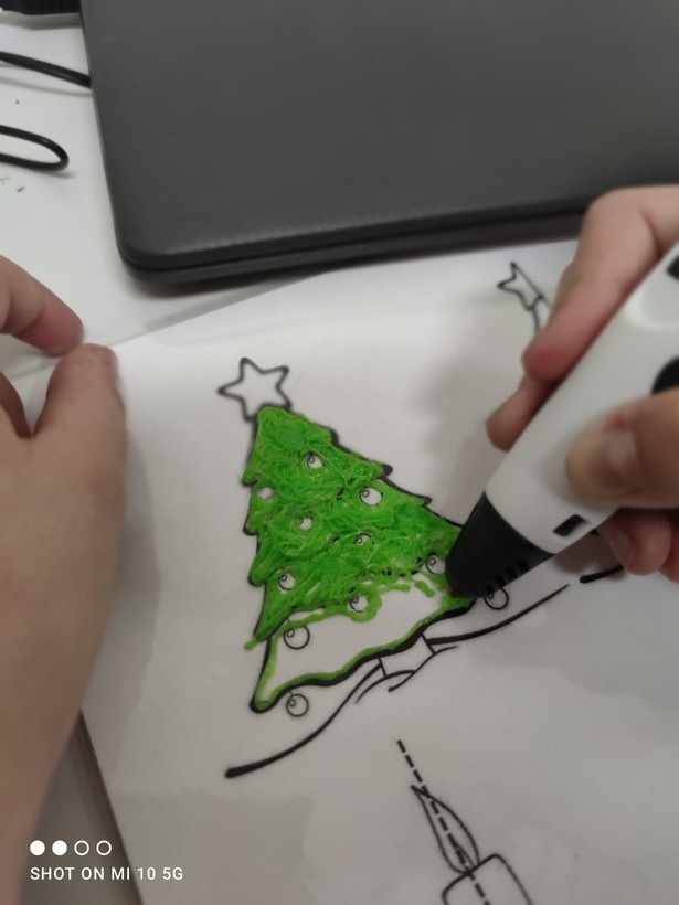W świątecznym nastroju uczniowie klas 5, na lekcjach informatyki, tworzą wspaniałe zimowe, świąteczne ozdoby z wykorzystaniem długopisów 3D.