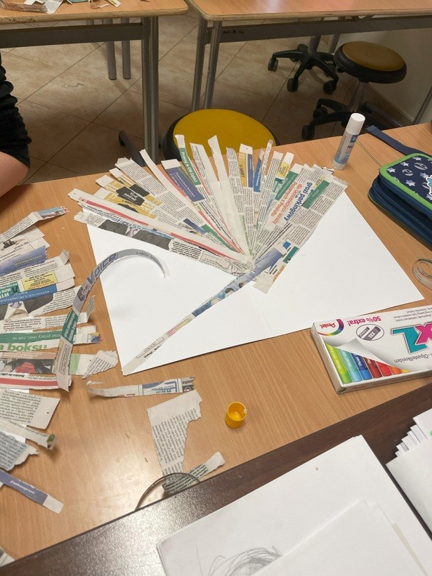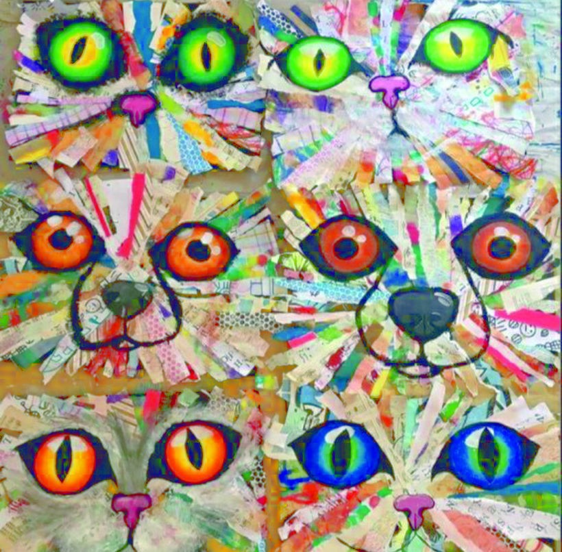 „Kot ma wielkie oczy” w formacie A3 to praca, która sprawiła uczniom wiele radości. Oprócz tego, że tworzyli portret jednego z ulubionych zwierząt dzieci, to samo darcie gazet na paski było rozluźniającą i odstresowującą techniką.