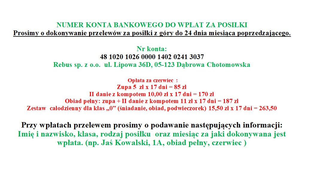 • Informacja o wpłatach za obiady - czerwiec 2025