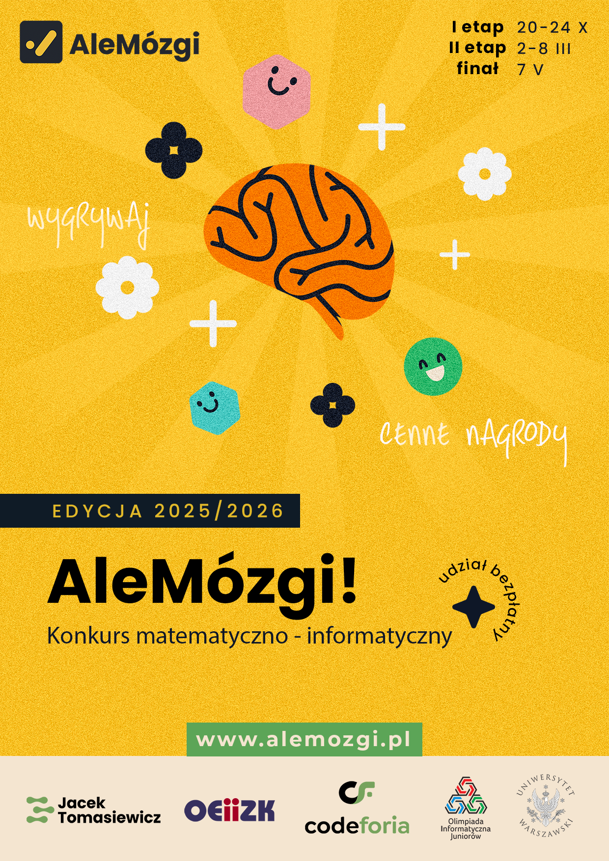 AleMózgi! to konkurs matematyczno-informatyczny, który nie wymaga wiedzy wstępnej, a jedynie umiejętności logicznego myślenia i chęci do nauki. Mogą w nim wziąć udział uczniowie klas 1-8 szkół podstawowych. Konkurs odbywa się w czterech kategoriach wiekowych: