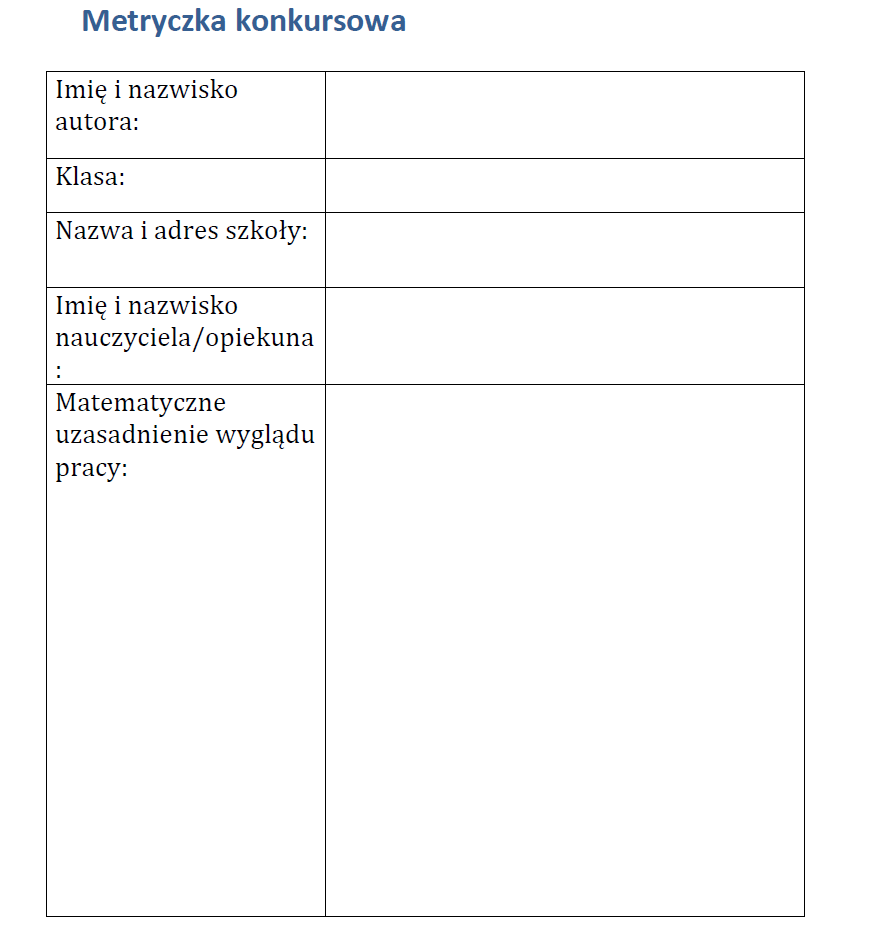 - zgodność pracy z tematem konkursu, - uwzględnienie elementów matematycznych, - oryginalność i kreatywność, - estetyka wykonania, - poprawność matematycznego uzasadnienia, - samodzielność wykonania pracy.