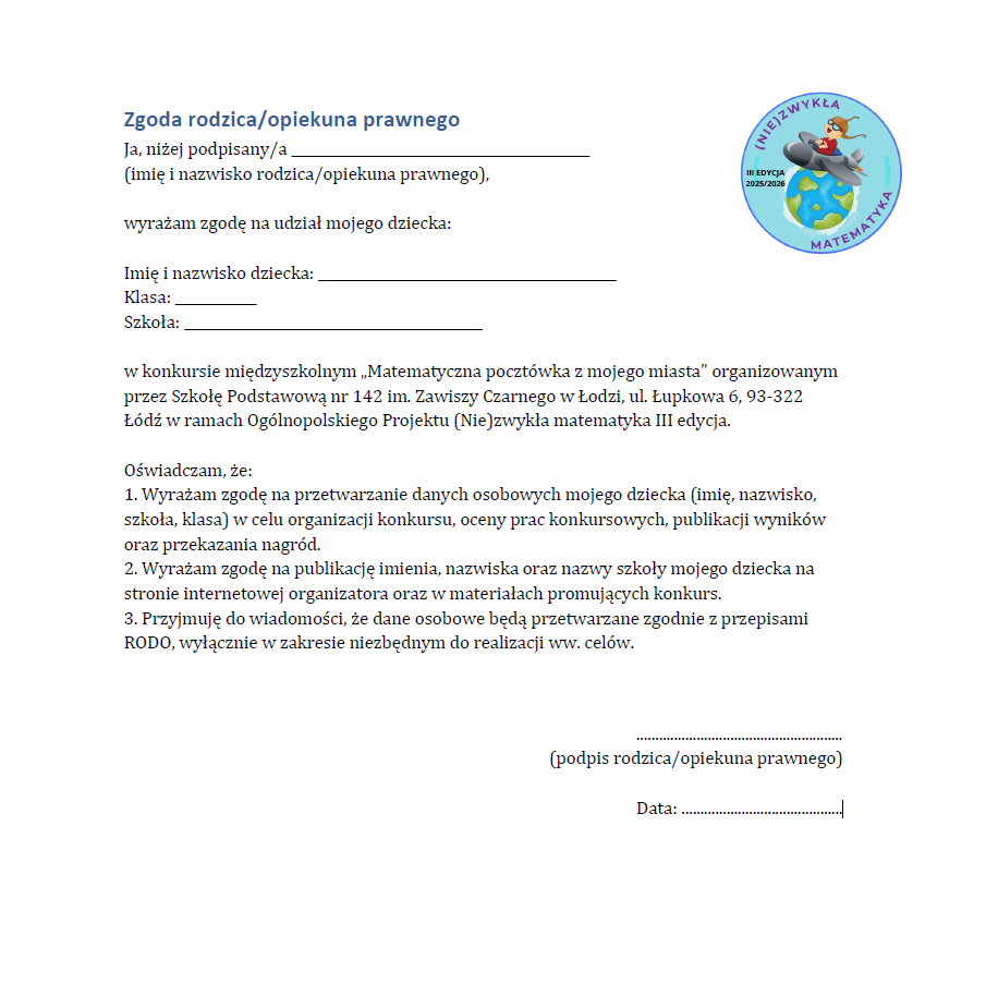 - Rodzice wypełniają zgodę za udział dziecka w konkursie /załącznk