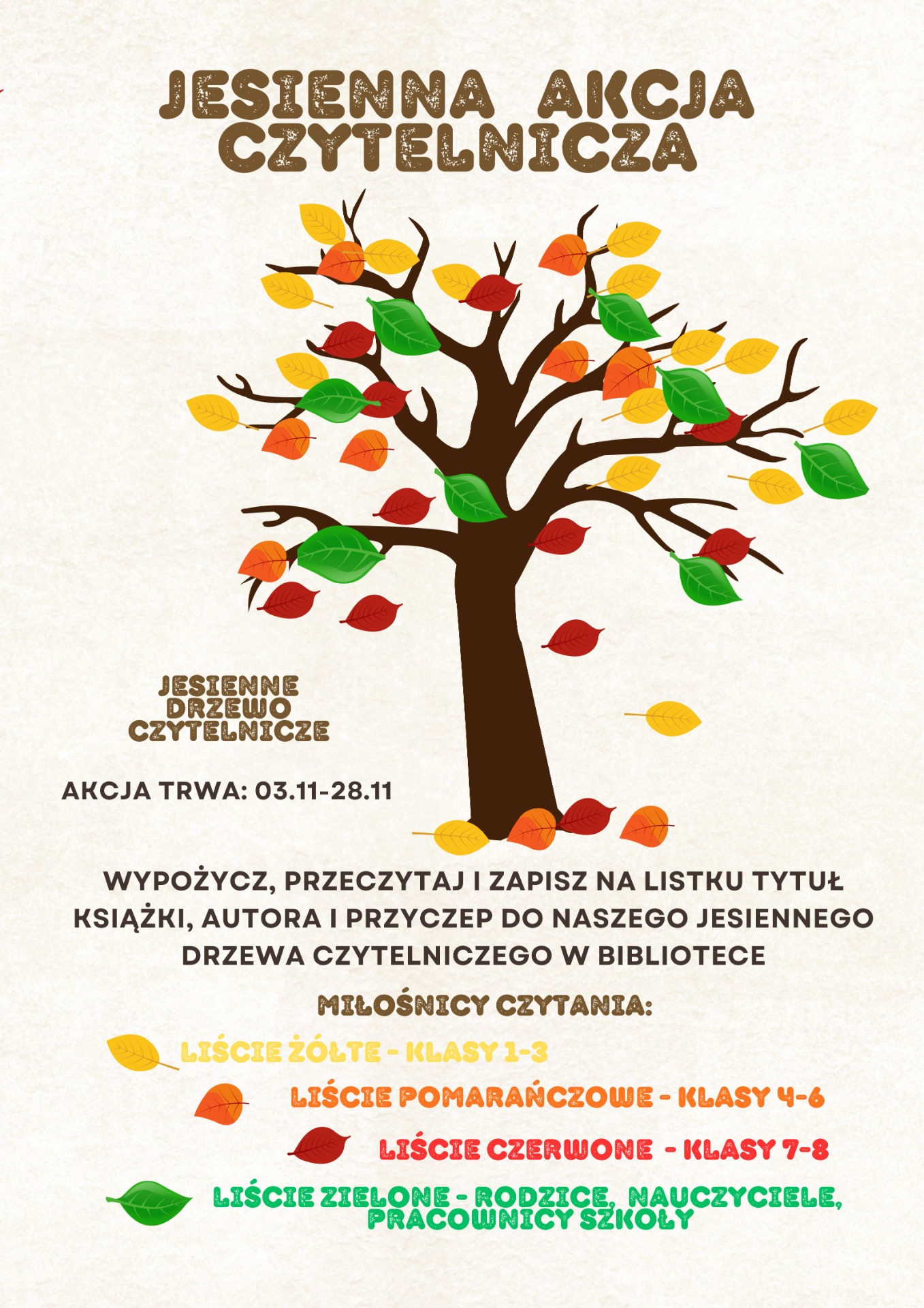 Za oknem opadają liście...W naszej bibliotece, na przekór jesiennej aurze, przez cały listopad tworzymy kolorowe, jesienne drzewo czytelnicze. Zapraszamy wszystkich do udziału. Szczegóły akcji na plakacie