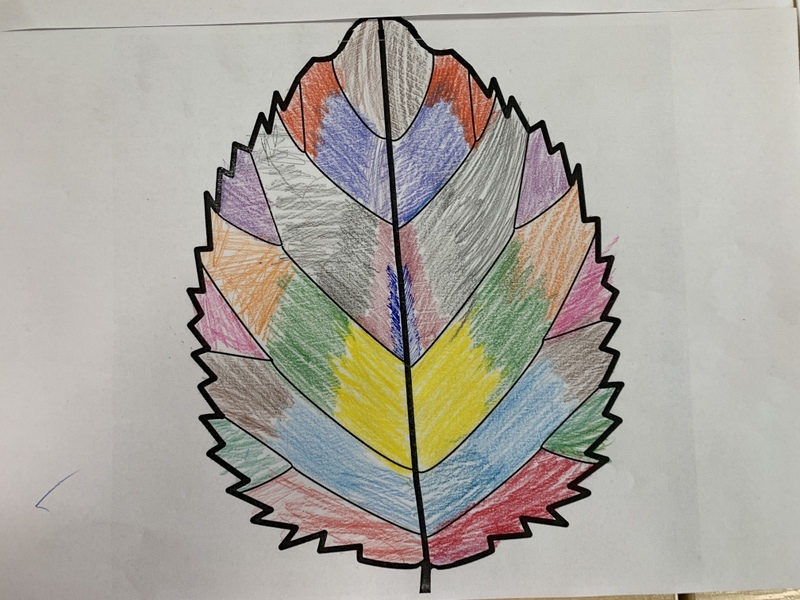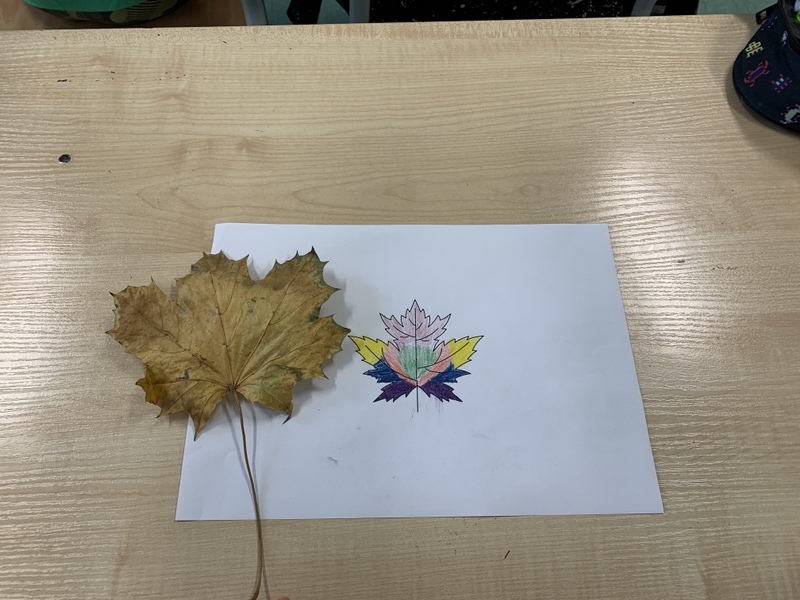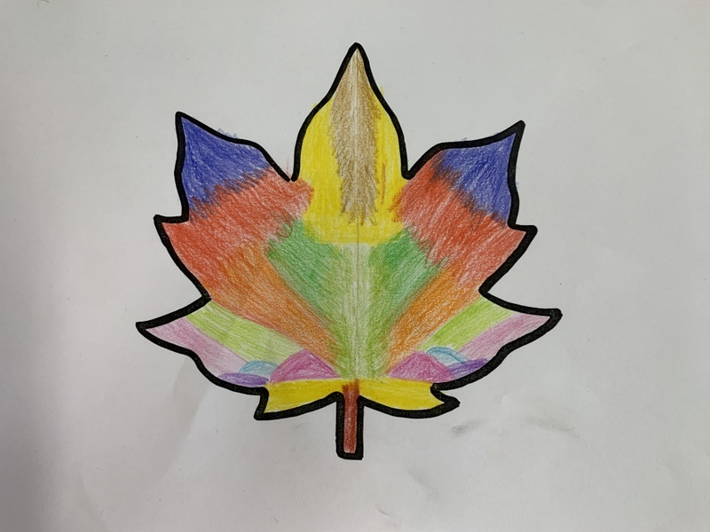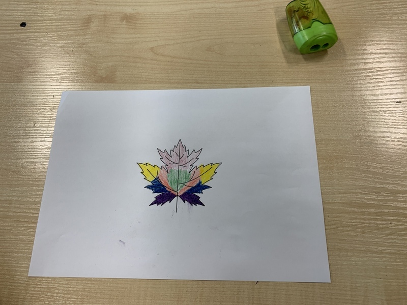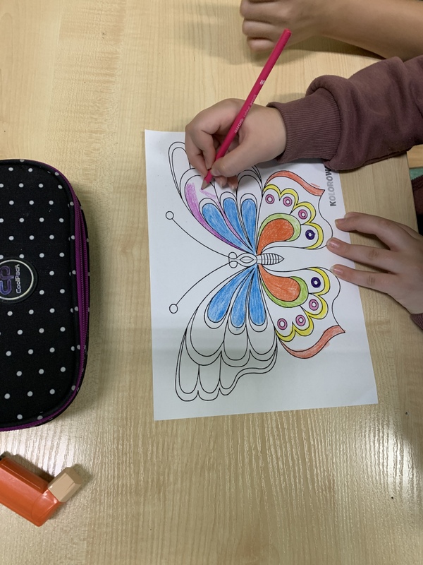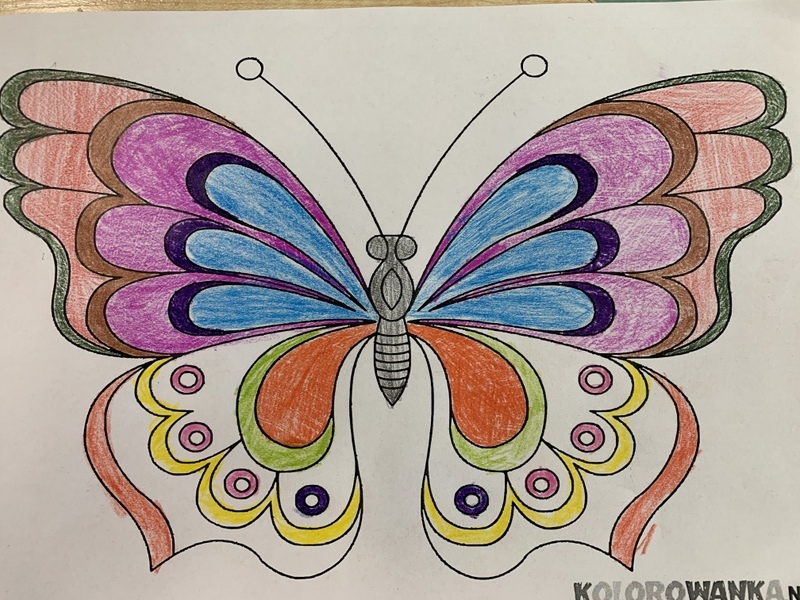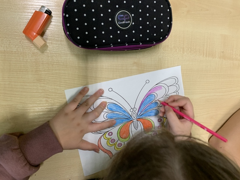 Następnie dzieci kolorowały symetryczne rysunki - jesienne liście, motyle i kwiaty - dbając o to, by po obu stronach osi kolory i kształty odpowiadały sobie jak w lustrzanym odbiciu.