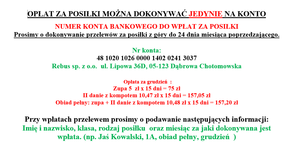 • Informacja o wpłatach za obiady - grudzień 2025