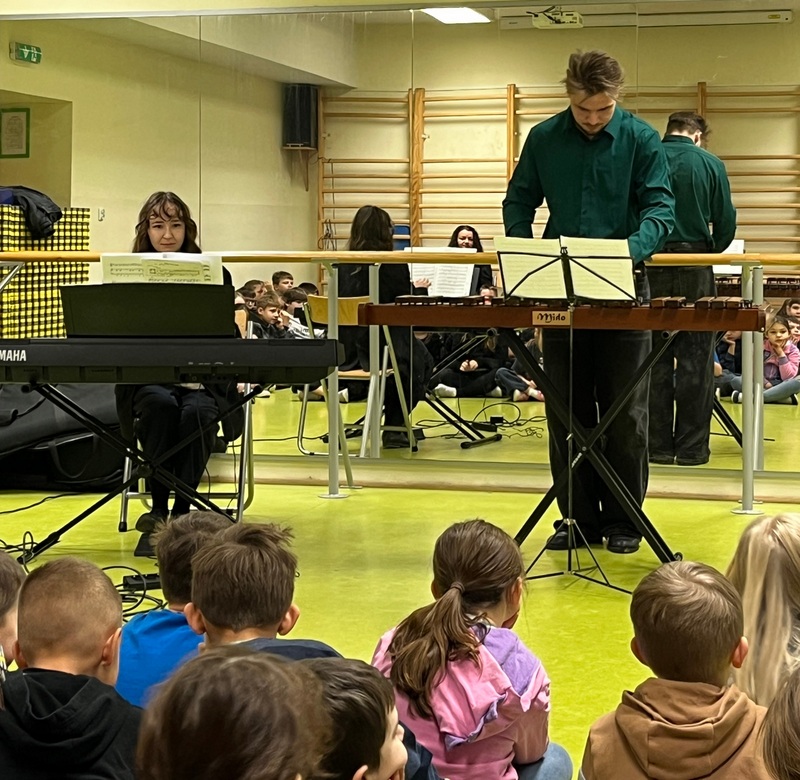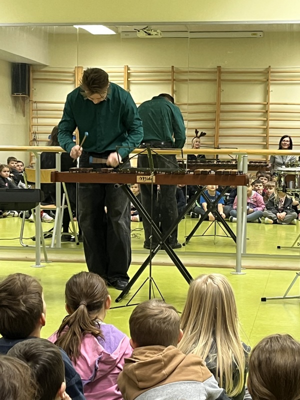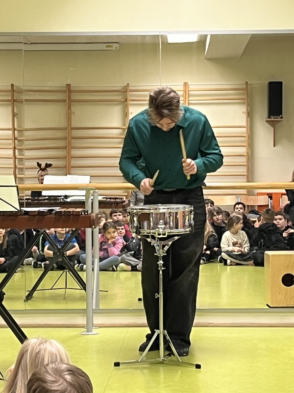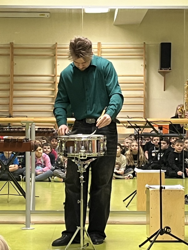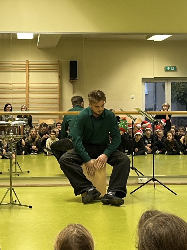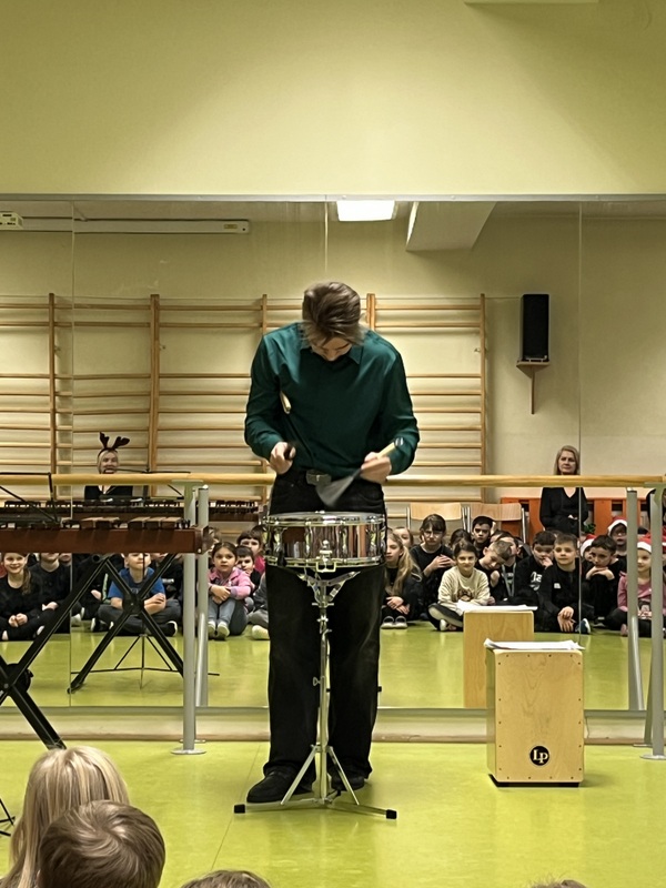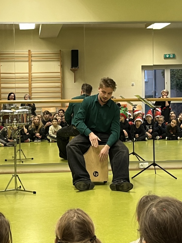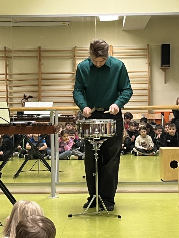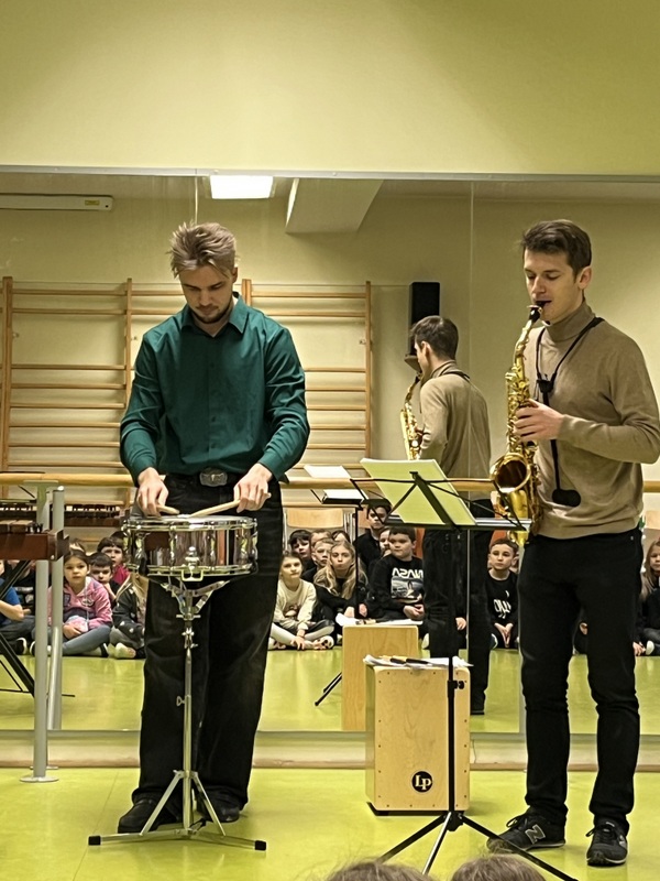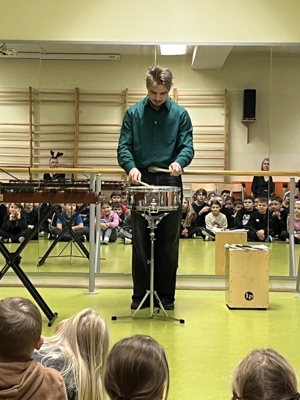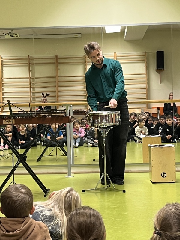 12 grudnia 2025r. wzięliśmy udział w czwartym koncercie edukacyjnym pt. „W PRACOWNI KOMPOZYTORA". Tym razem muzycy FN zaprosili nas na koncert muzyki XX wieku. Dowiedzieliśmy się jakie tajemnice kryły się w pracowni kompozytora tworzącego w poprzednim stuleciu. W odpowiedzi na to pytanie wysłuchaliśmy połączeń melodyjności saksofonu z rytmicznym brzmieniem perkusji. Podczas koncertu pan perkusista powiedział nam, że instrumenty perkusyjne dzielą się na melodyczne, które mogą zagrać melodię (np. ksylofon, wibrafon, dzwonki rurowe), oraz niemelodyczne, do tworzenia rytmu i efektów dźwiękowych (np. bębny, talerze, tamburyn, marakasy). Na żywo wysłuchaliśmy ksylofonu, werbla, cajón (czytaj kahon, z hiszp. – skrzynia) oraz fortepianowych akordów.
