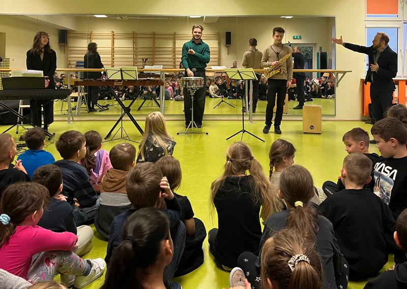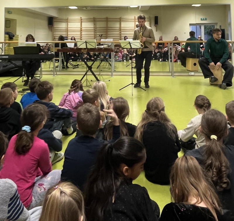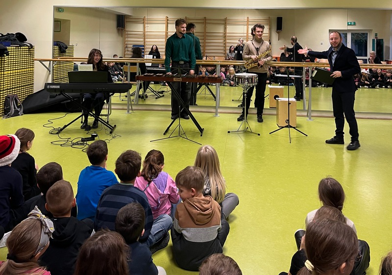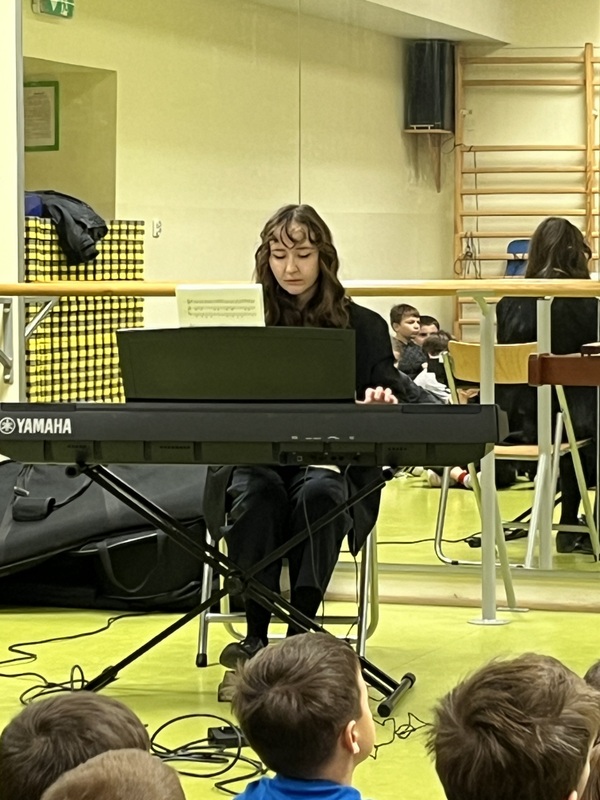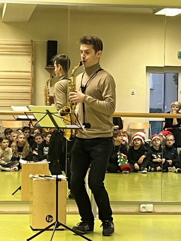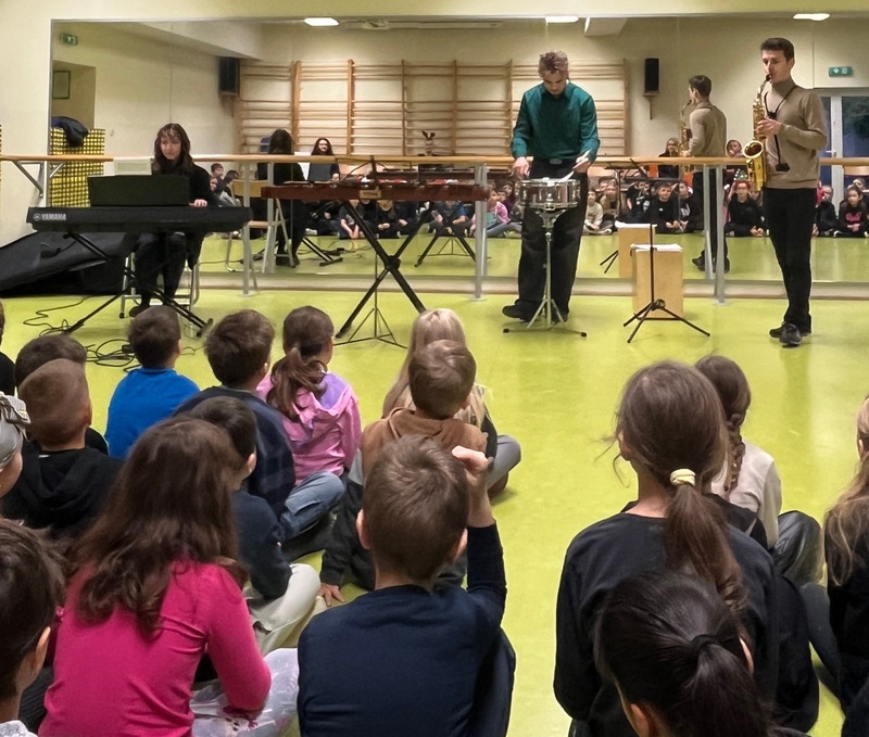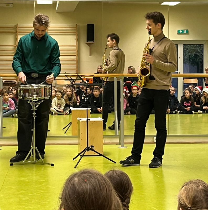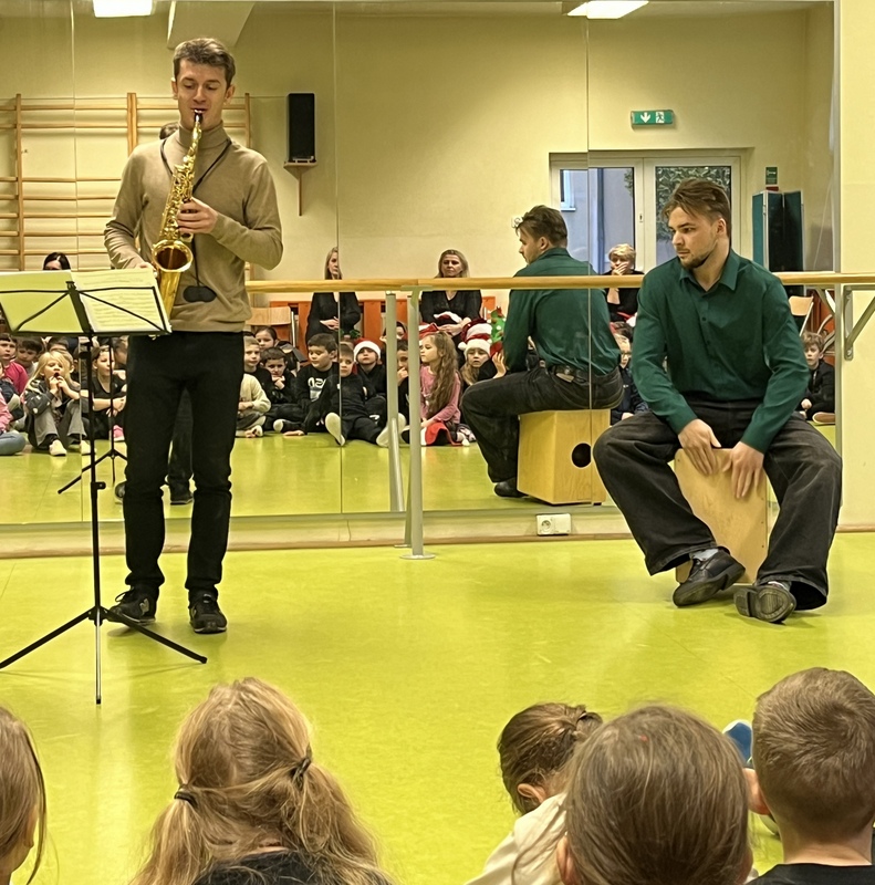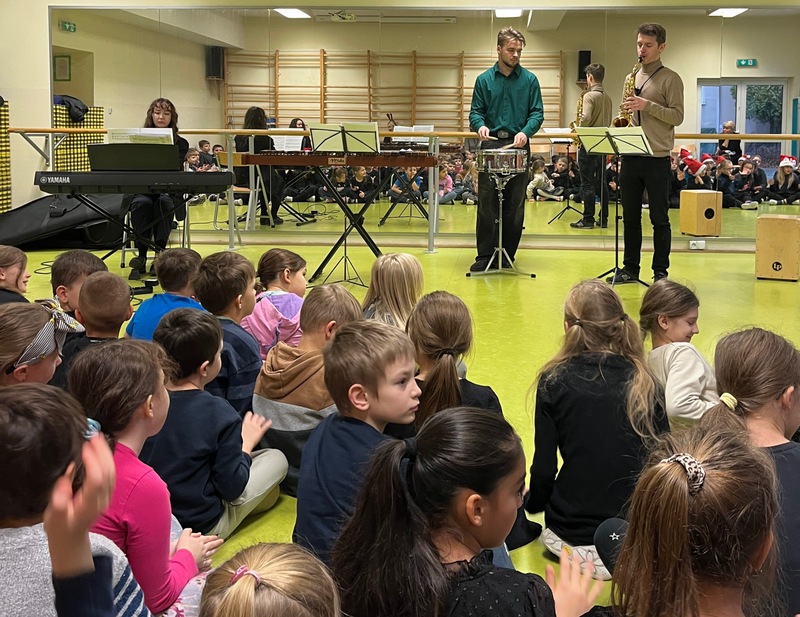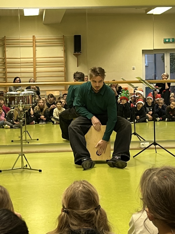 12 grudnia 2025r. wzięliśmy udział w czwartym koncercie edukacyjnym pt. „W PRACOWNI KOMPOZYTORA". Tym razem muzycy FN zaprosili nas na koncert muzyki XX wieku. Dowiedzieliśmy się jakie tajemnice kryły się w pracowni kompozytora tworzącego w poprzednim stuleciu. W odpowiedzi na to pytanie wysłuchaliśmy połączeń melodyjności saksofonu z rytmicznym brzmieniem perkusji. Podczas koncertu pan perkusista powiedział nam, że instrumenty perkusyjne dzielą się na melodyczne, które mogą zagrać melodię (np. ksylofon, wibrafon, dzwonki rurowe), oraz niemelodyczne, do tworzenia rytmu i efektów dźwiękowych (np. bębny, talerze, tamburyn, marakasy). Na żywo wysłuchaliśmy ksylofonu, werbla, cajón (czytaj kahon, z hiszp. – skrzynia) oraz fortepianowych akordów.