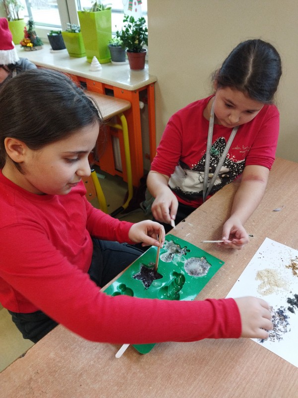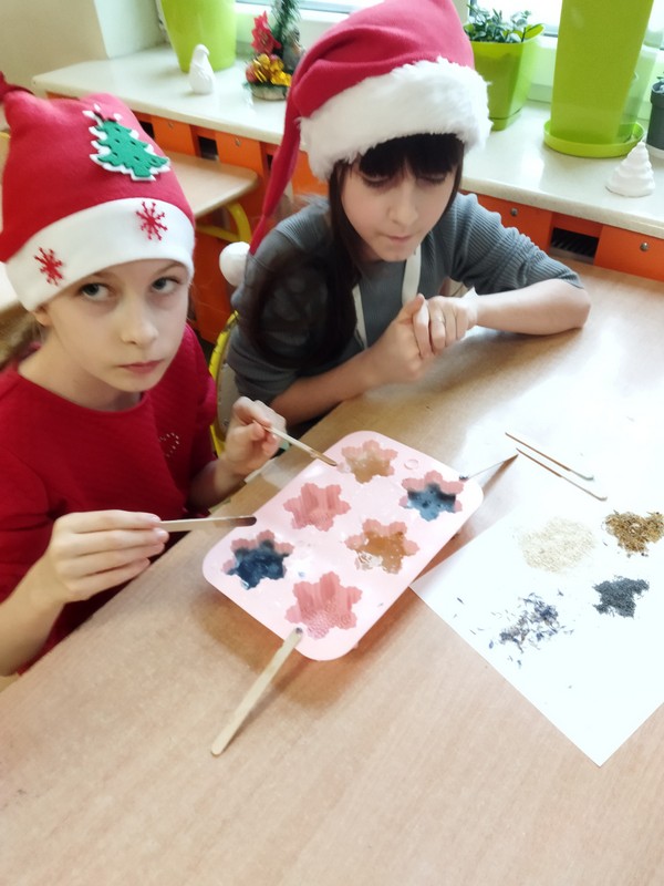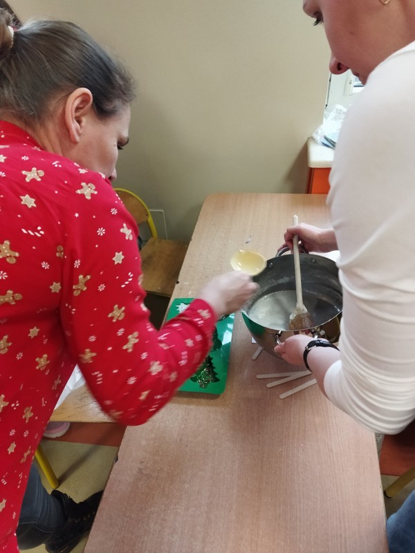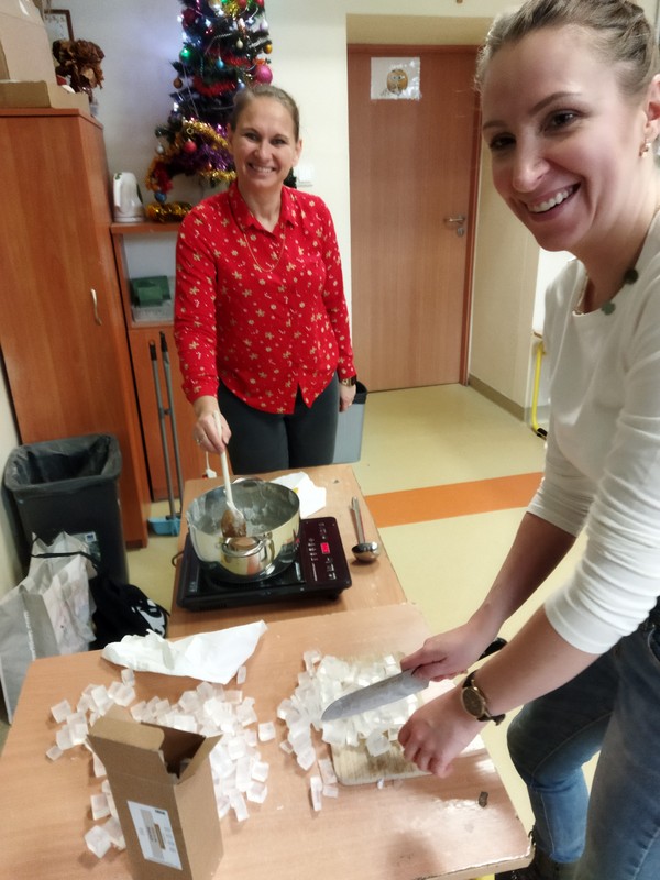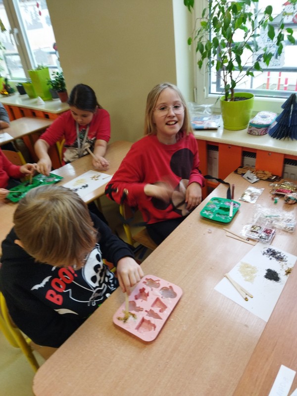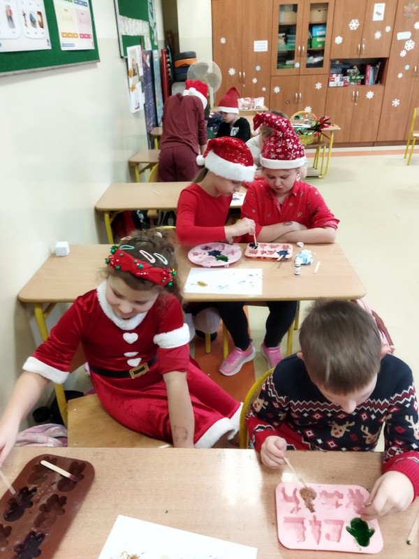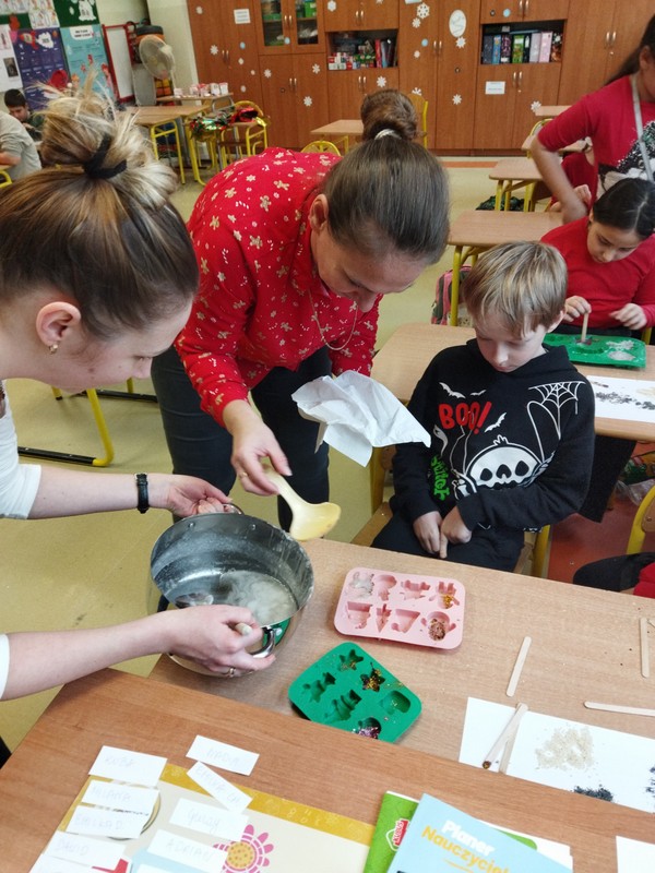 Mamy uczennic z klasy 3A p. Marzena Maćkiewicz i p. Magdalena Świąder zorganizowały warsztaty mydlarskie dla uczniów. Dzieci mogły samodzielnie wybrać kolory, kształty oraz ozdoby do wykonania mydełek. Prace te mogły wykorzystać jako prezenty świąteczne dla swoich bliskich.