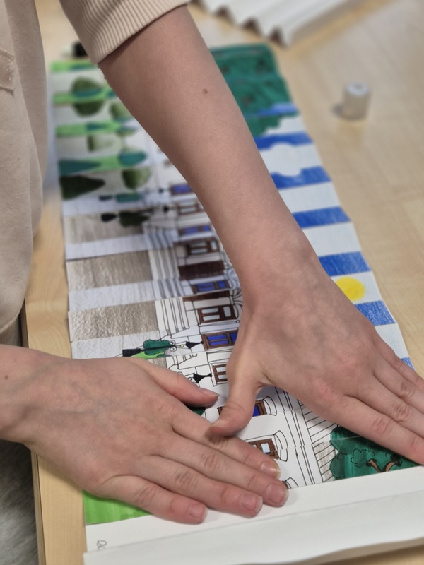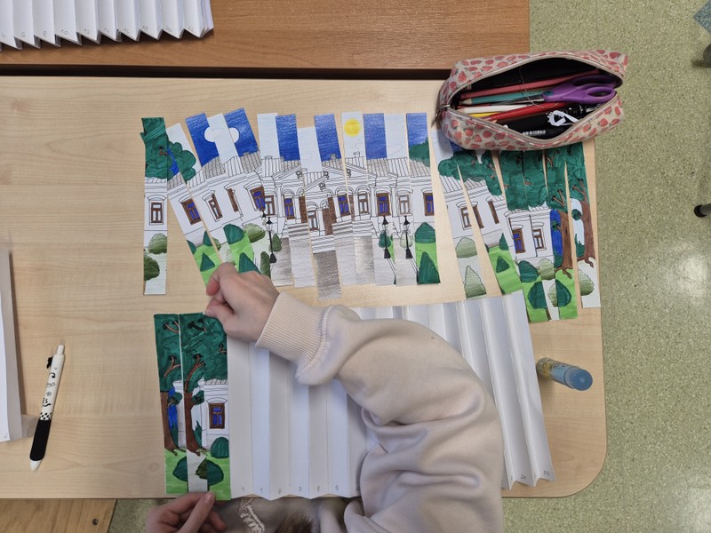 Uczniowie pomalowali dwa rysunki przedstawiające ten sam obiekt: dworek za dnia oraz dworek nocą. Następnie prace zostały pocięte na paski i połączone naprzemiennie, tworząc dwuwymiarowy obraz o zmiennym charakterze. W zależności od punktu widzenia odbiorcy, widoczny jest dworek skąpany w świetle dnia lub nocna sceneria. Dzięki temu uczniowie mogli doświadczyć, jak zmiana perspektywy wpływa na odbiór tego samego miejsca.